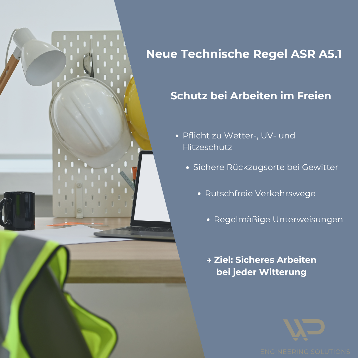 🆕 Neue Technische Regel ASR A5.1: Schutz bei Arbeiten im Freien und in offenen Arbeitsstätten Seit August 2025 gilt die neue Technische Regel für Arbeitsstätten